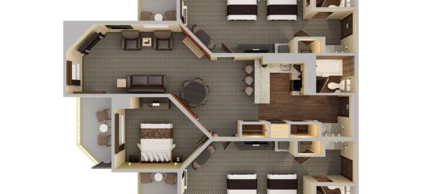 The 3 Bedroom Kitchen Living Room Suite is comprised of a King Living Room Kitchen Suite and two Double Queen Room with Balconies. This suite contains three bedrooms: one with king bed and 2 rooms with two queen beds each. Three bathrooms, including one with a whirlpool tub. There is a living room group with queen sofa sleeper, fireplace, a fully equipped kitchen and dining room set.